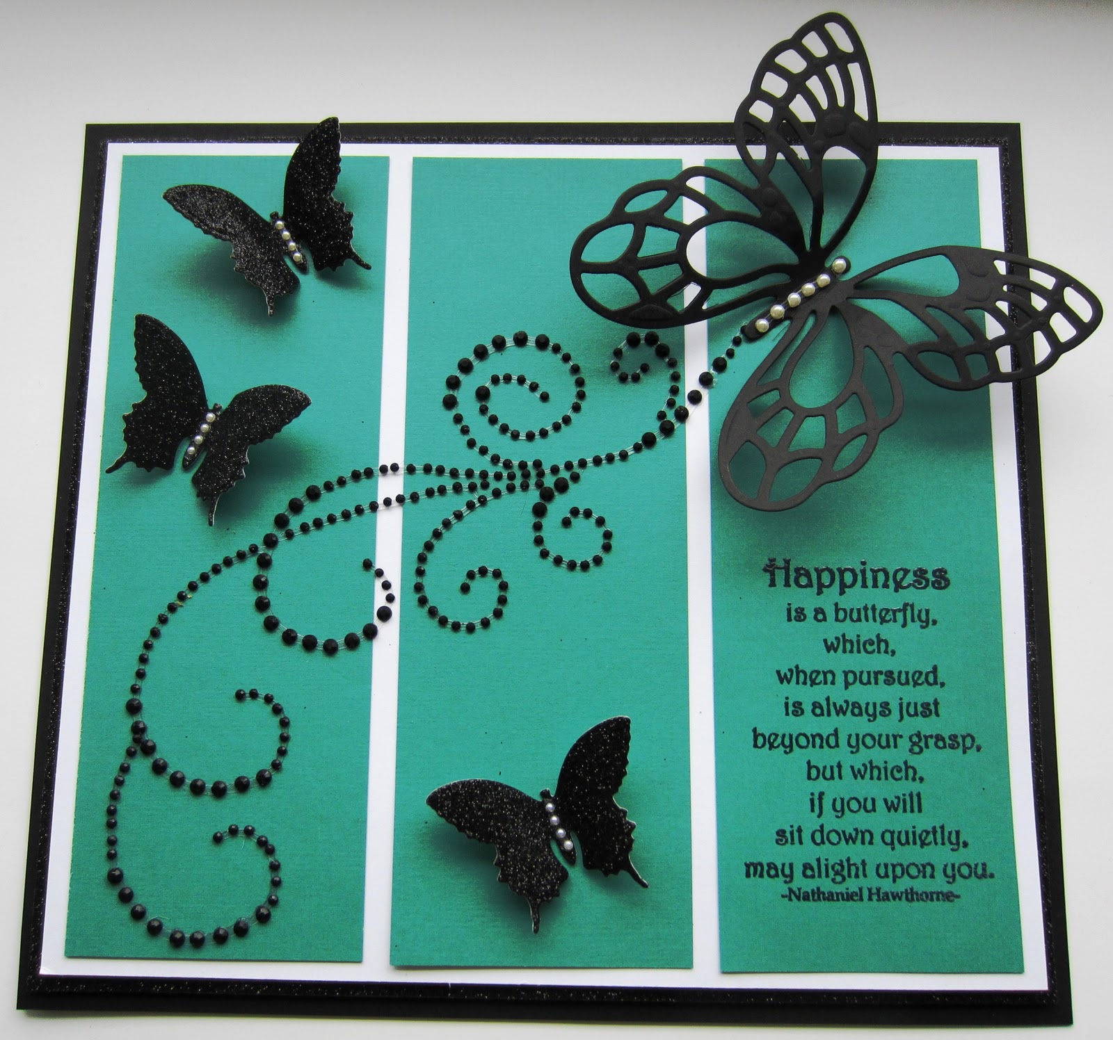 I used a 8x8 inch square card blank and layered basic black card, gloss white and then three panels of elegant eggplant spaced equally on top. I cut one large and three smaller butterflies from black card stock and shaped the wings before I secured them across the panels. The greeting was stamped with versamark ink and embossed with white embossing powder. The swirls were added using enamel accents freehand and for my first attempt I was rather pleased with how they look. I finished with gems on the bodies of each of the butterflies.